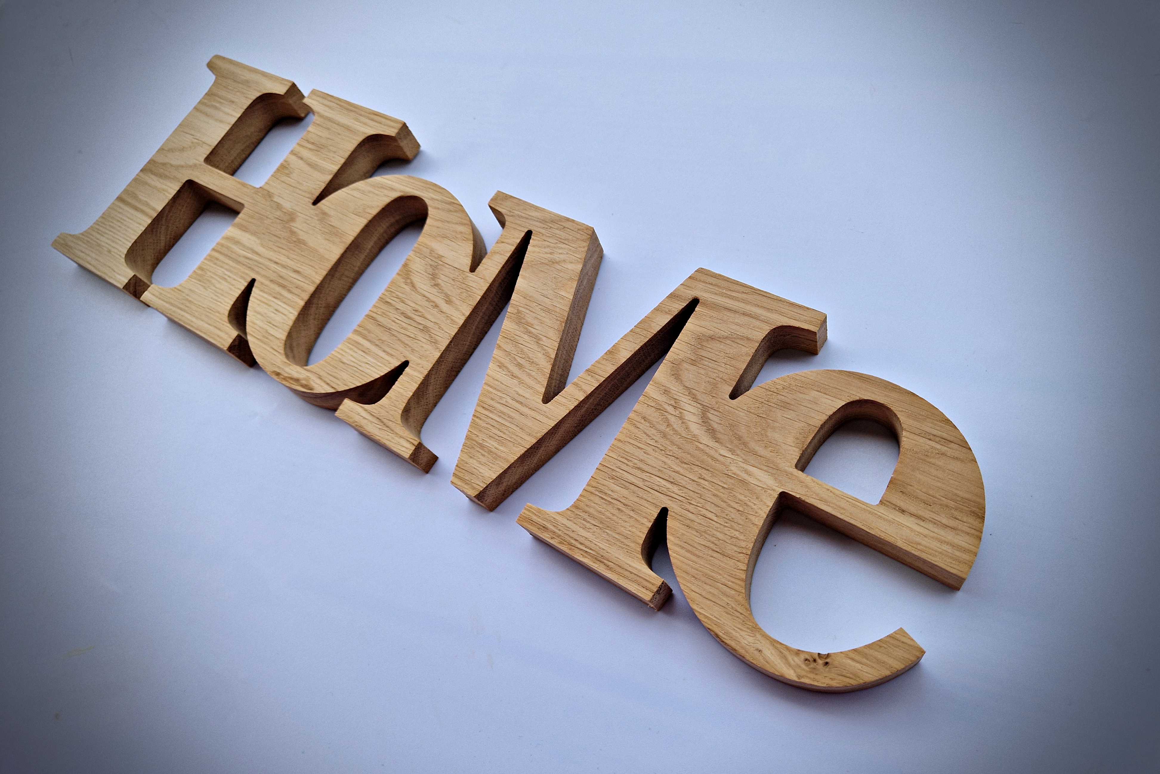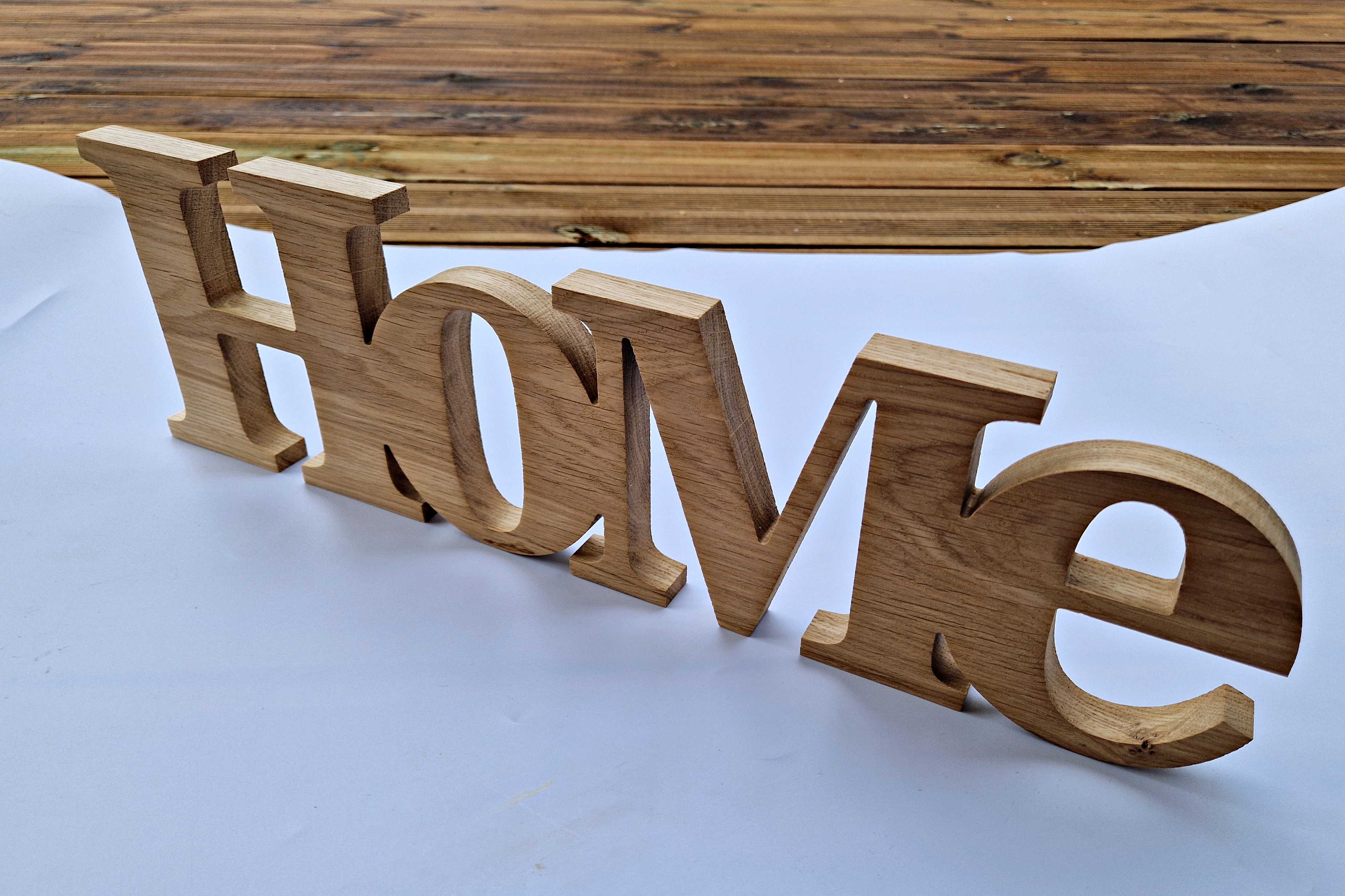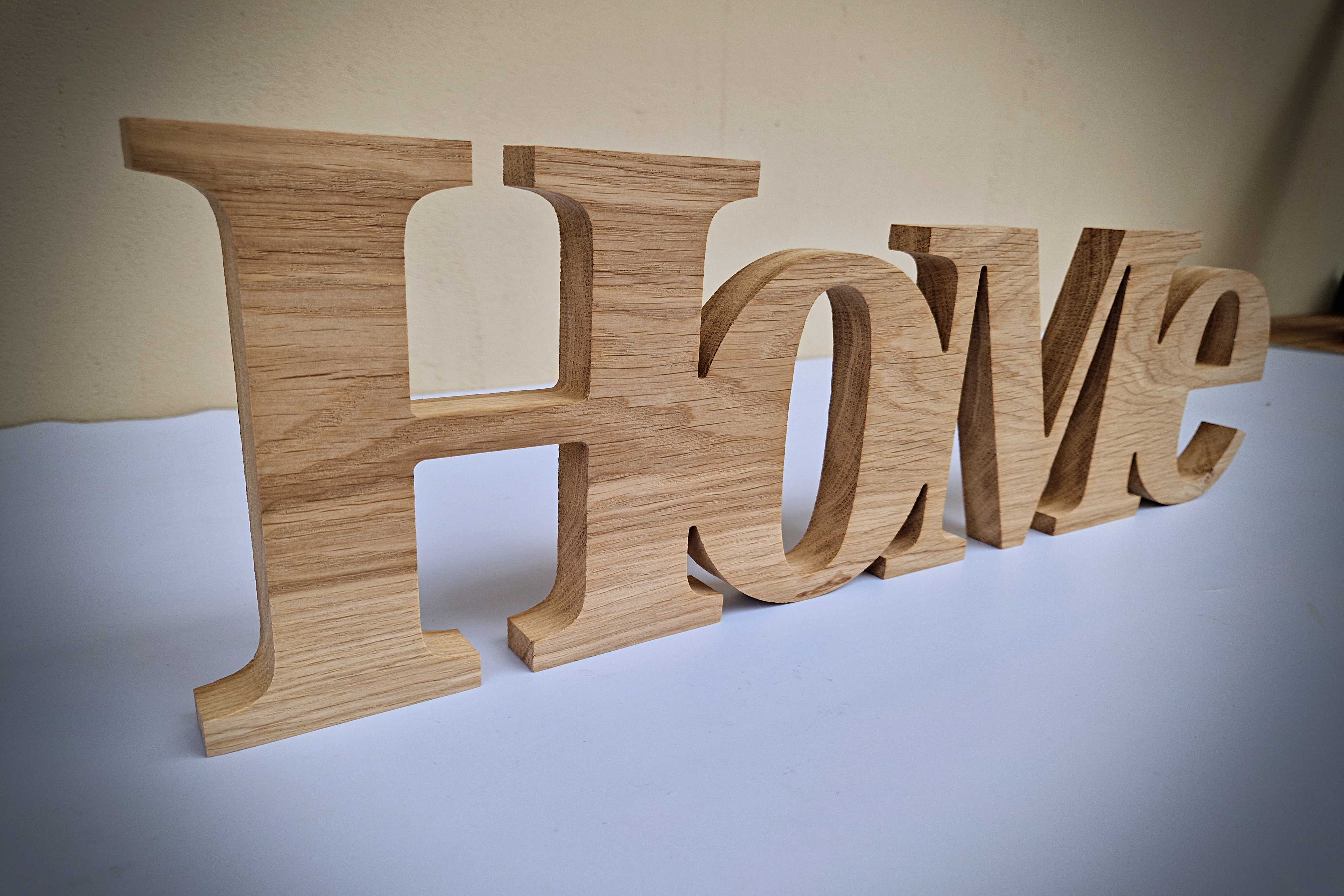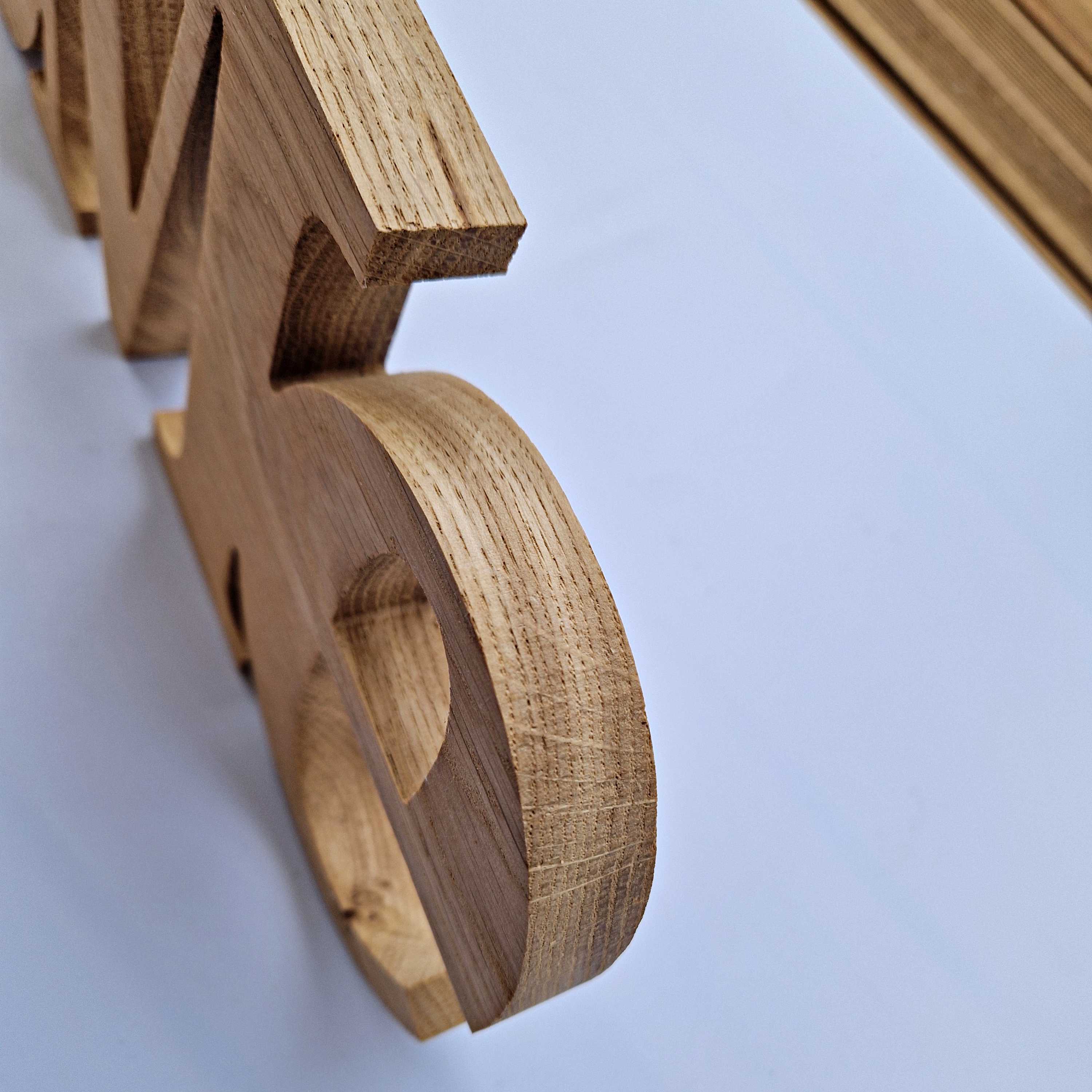 Naturalne drewno sprawia, że każdy egzemplarz ma unikalny rysunek słojów i odcień, co dodatkowo podkreśla jego wyjątkowy charakter. Na zdjęciach przedstawiony jest napis wykonany z dębu.