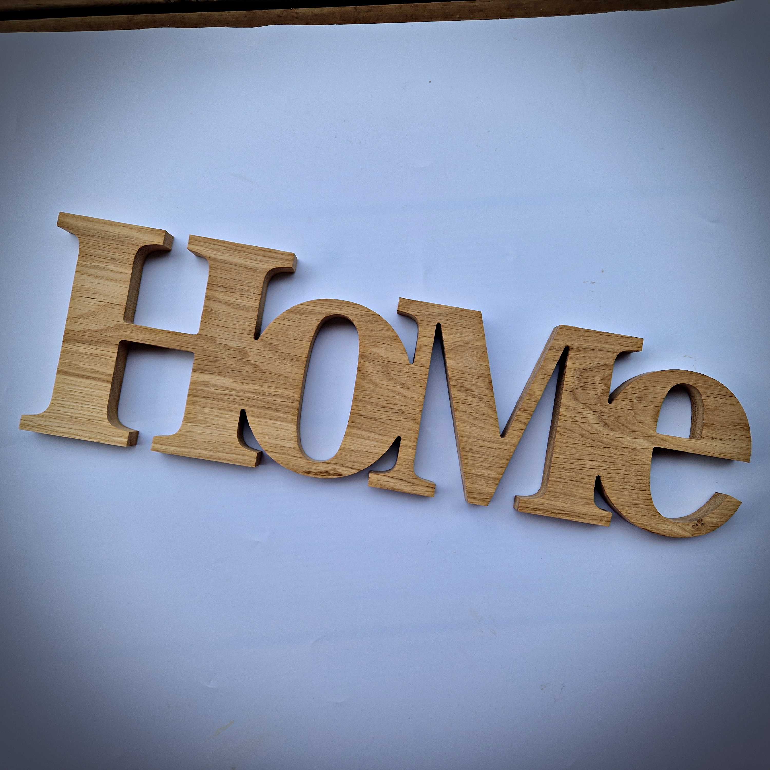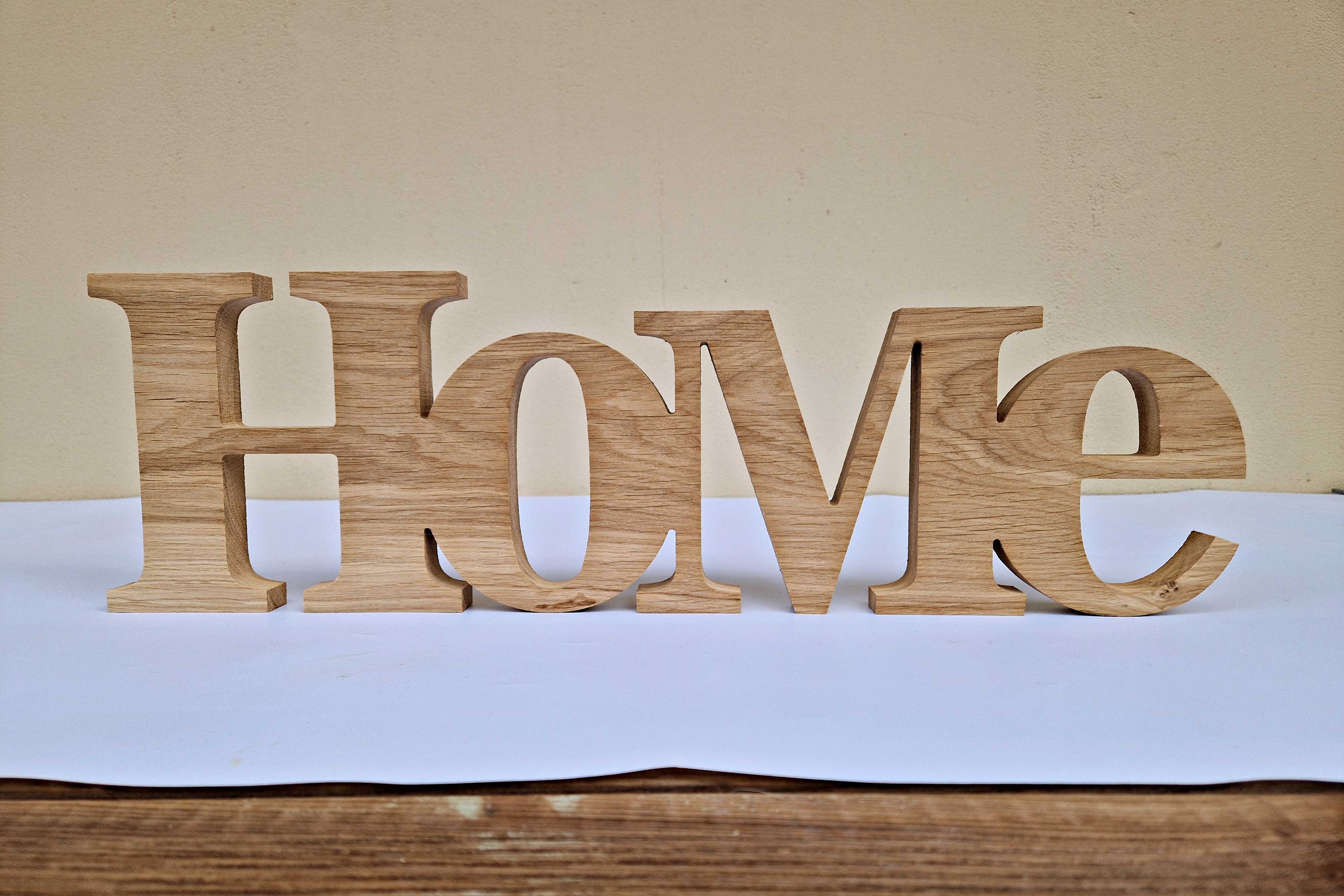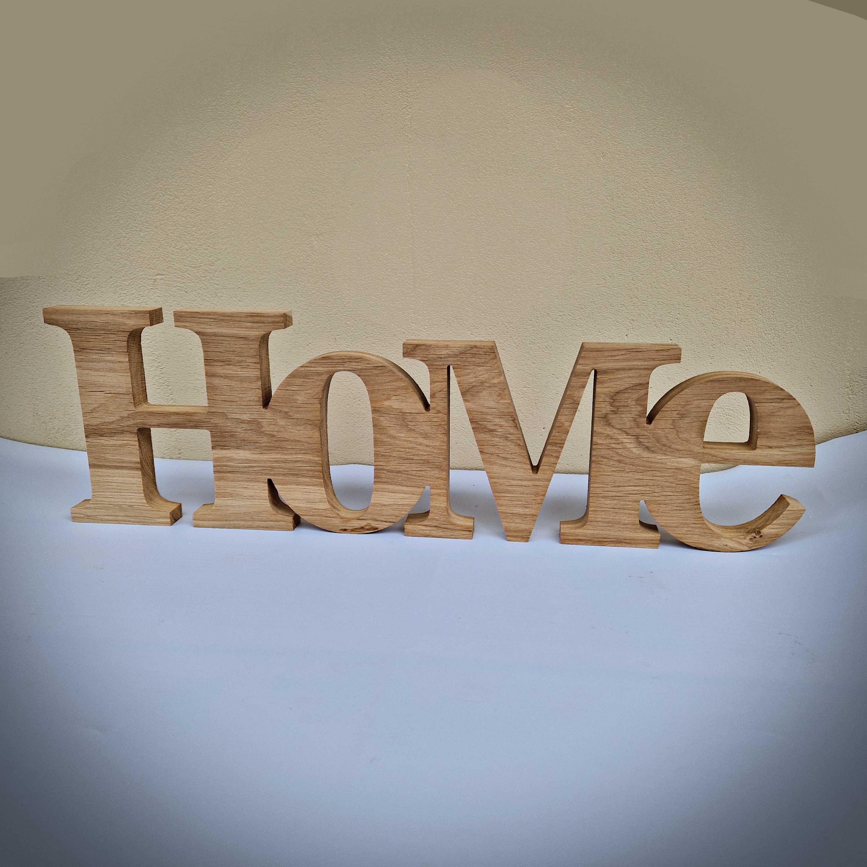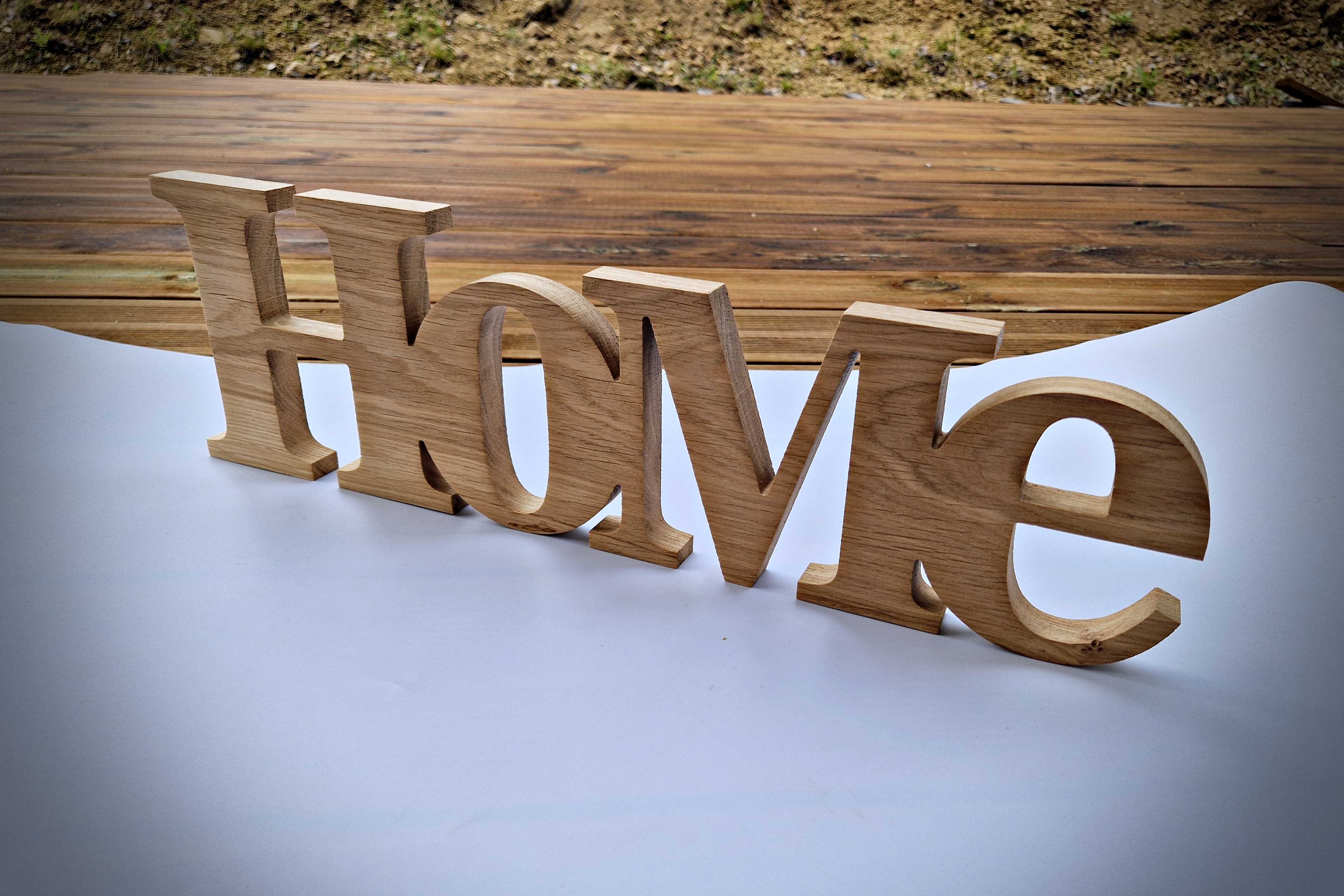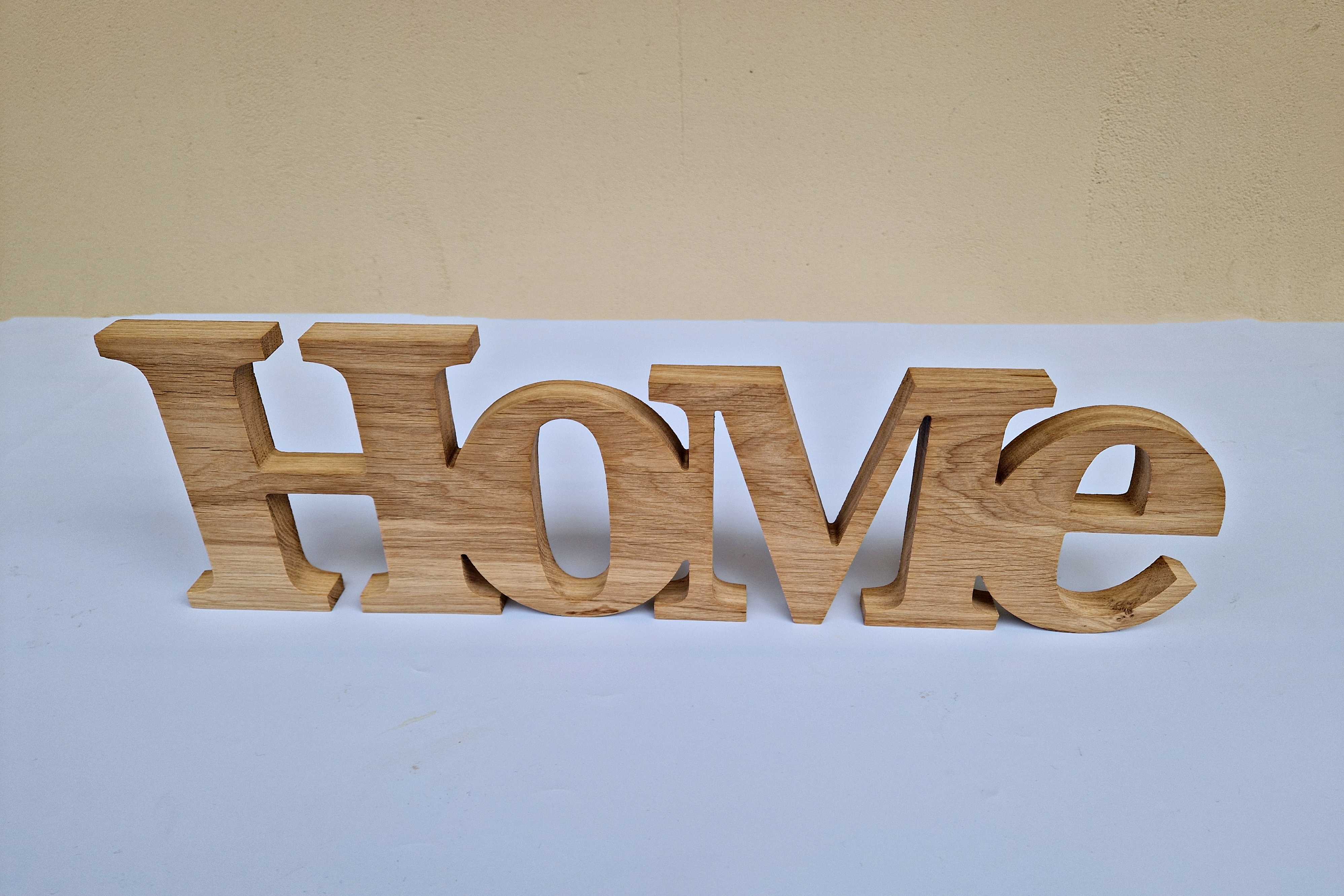 Naturalne drewno sprawia, że każdy egzemplarz ma unikalny rysunek słojów i odcień, co dodatkowo podkreśla jego wyjątkowy charakter. Na zdjęciach przedstawiony jest napis wykonany z dębu.